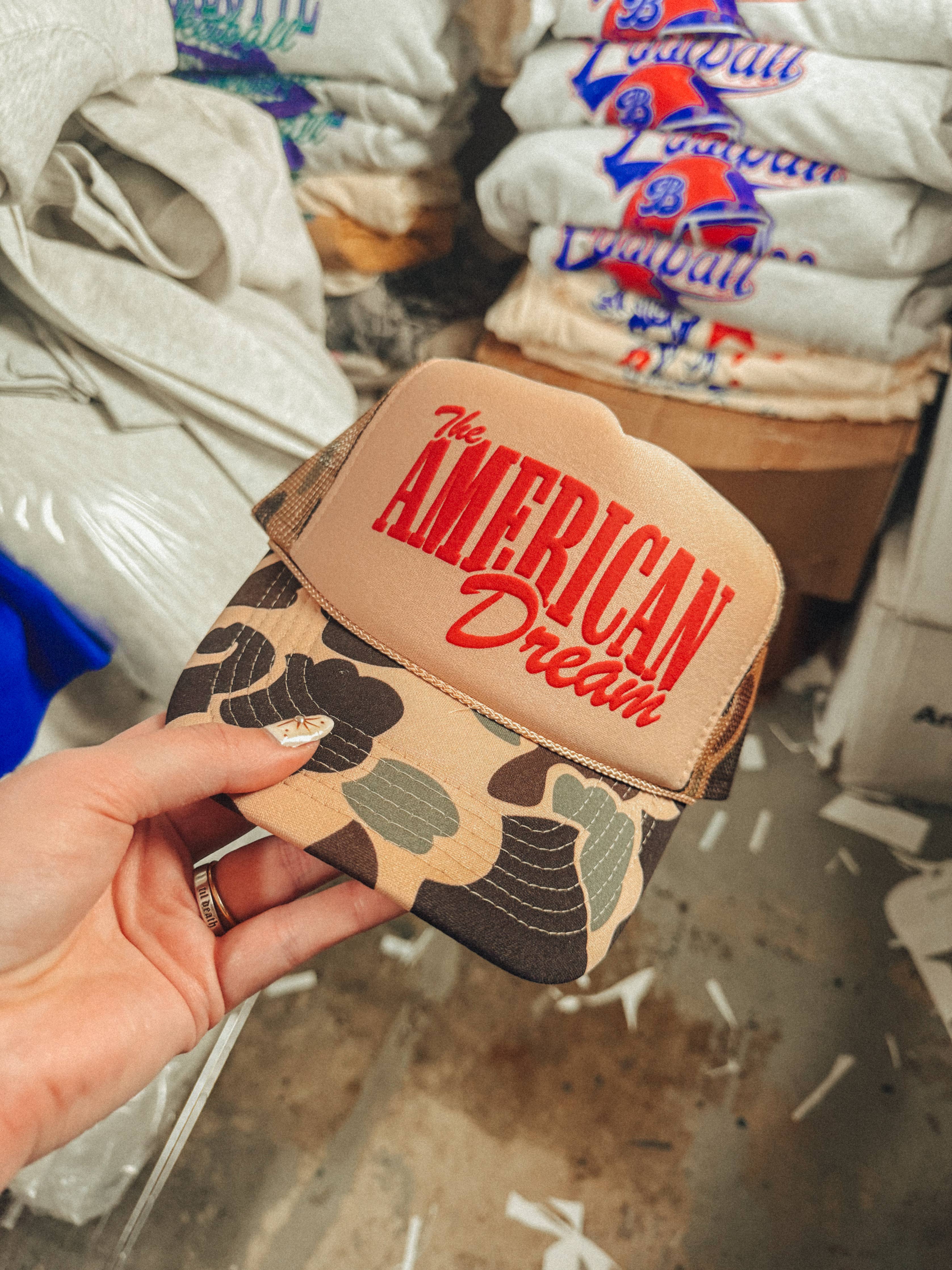 The American Dream Trucker Hat is camo done right. Easy to wear, and hard to ignore. Throw it on with a dress, fur coat, or a classic band tee. The American Dream Trucker Hat is made for back roads, bar nights, and a good time.