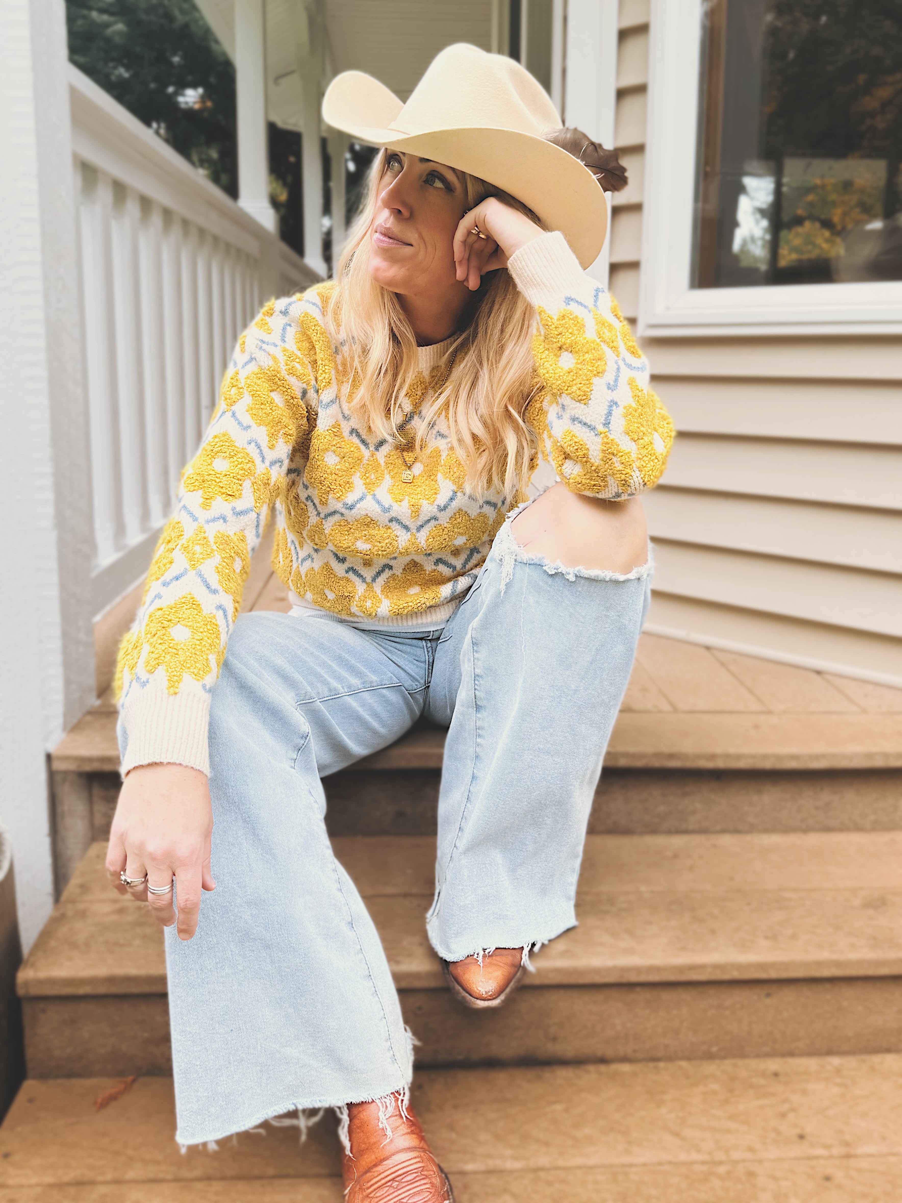 Our Flower in the Sun Sweater is straight from the 70s. Throw on this plush, cozy sweater and get thrown into 70s glam. With a thick knit and soft texture this is an easy go to for winter layering!