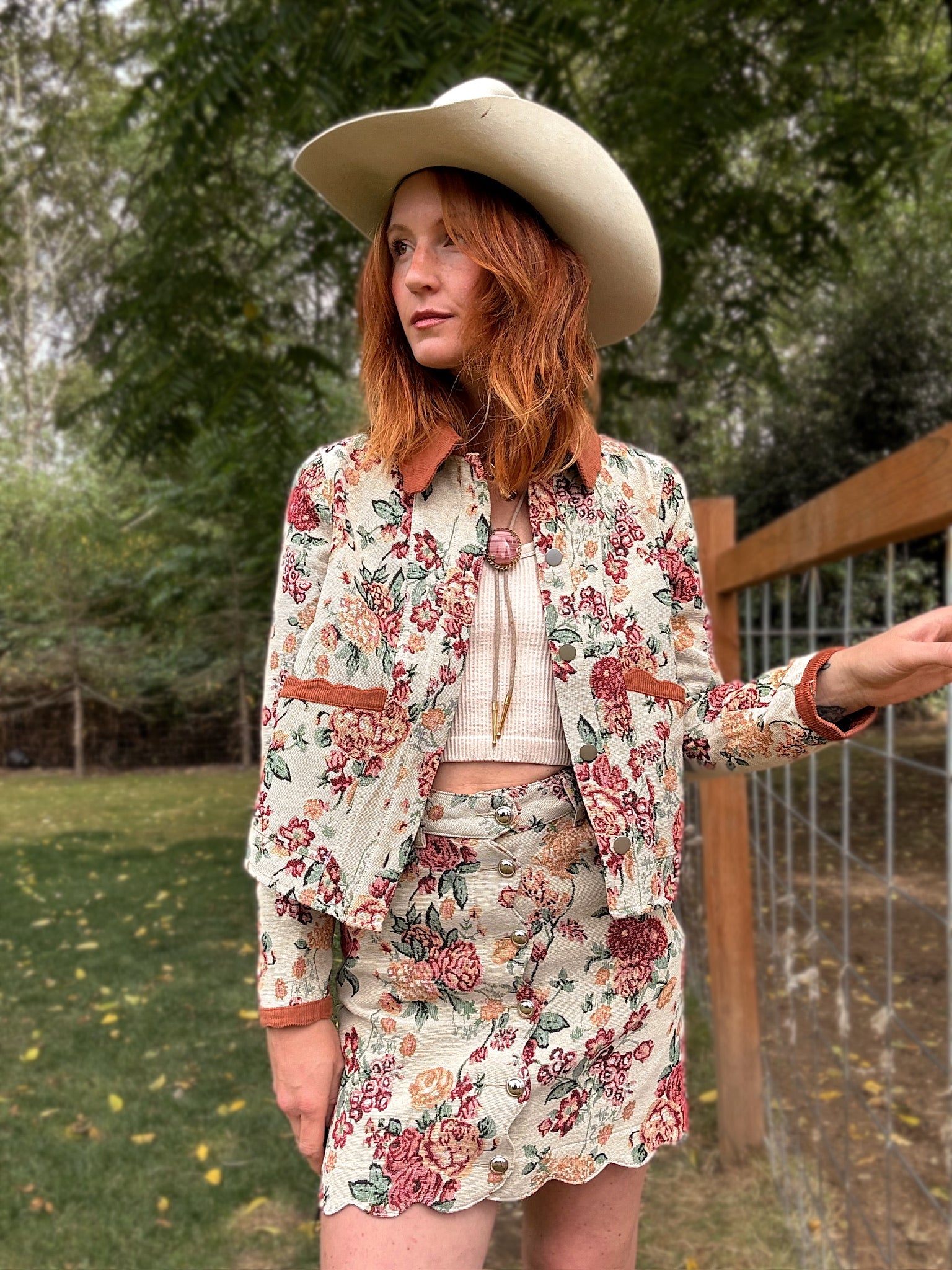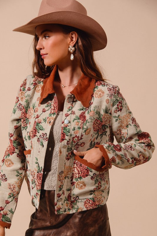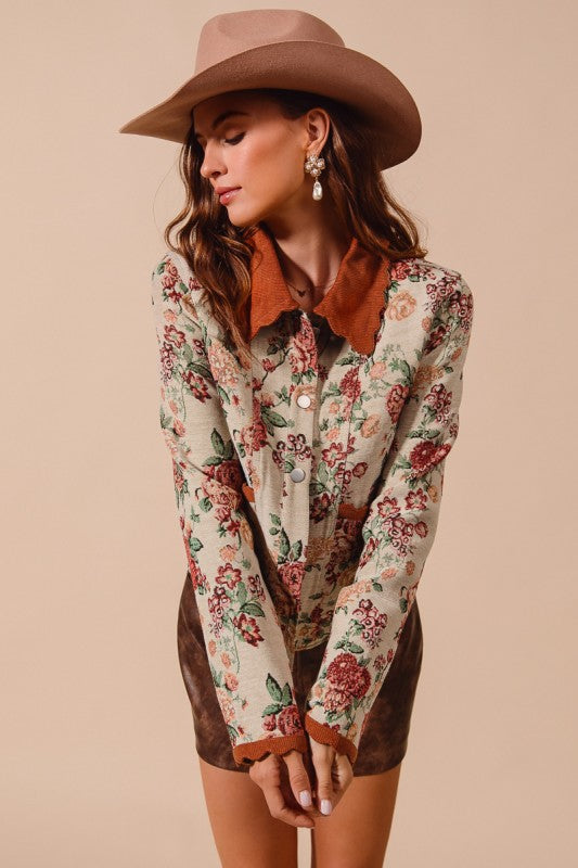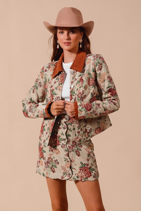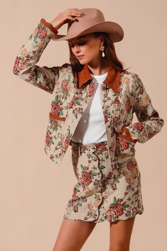 You'll be the talk of the town with the Letting Me Down Jacquard Tapestry Jacket, crafted from bold floral jacquard tapestry fabric. This matching set delivers an unapologetic statement outfit that commands attention with its rich texture and intricate design. Perfect for those who embrace fearless fashion and crave a powerful, unforgettable look. Pair with matching skirt sold separately.