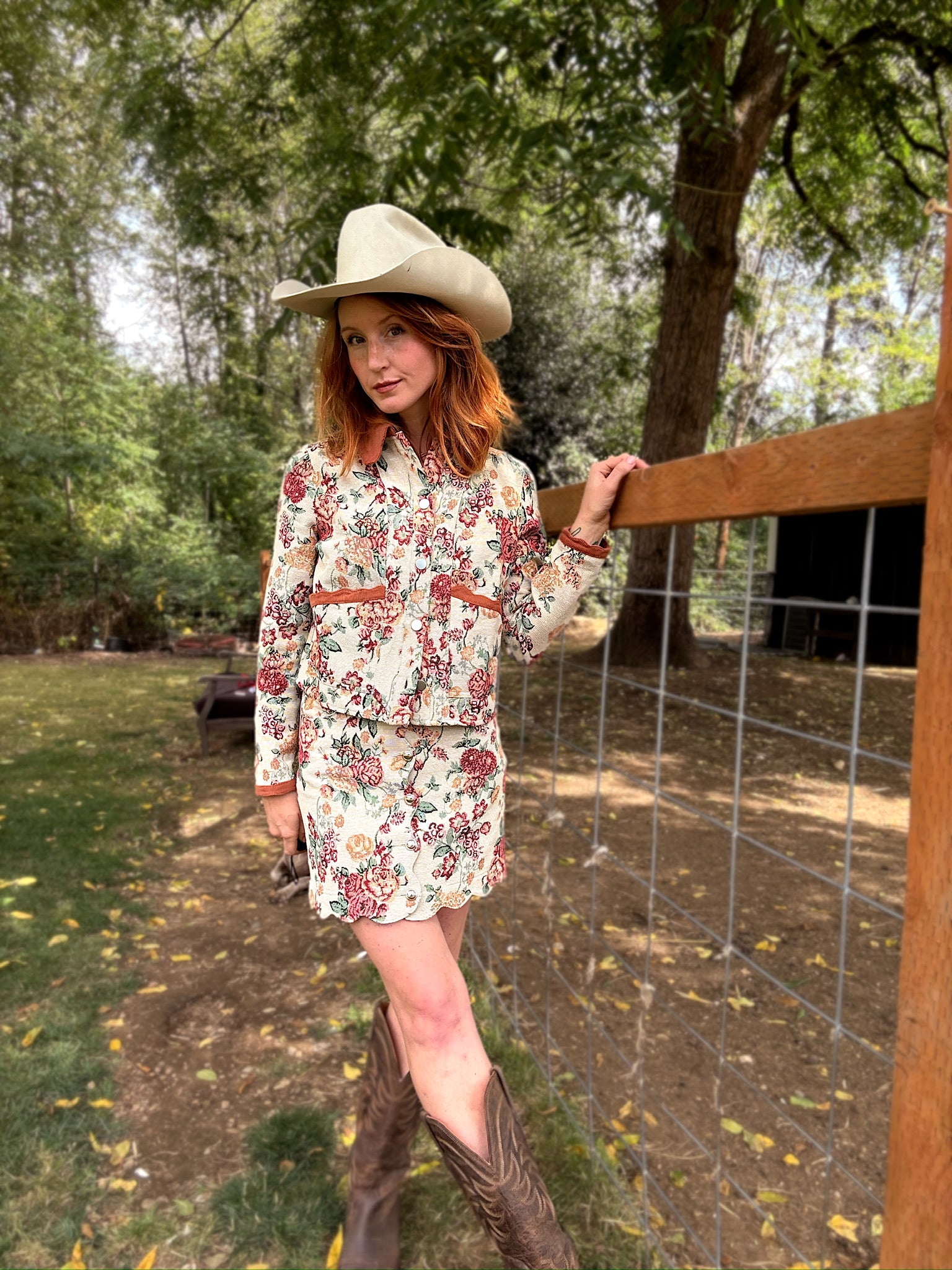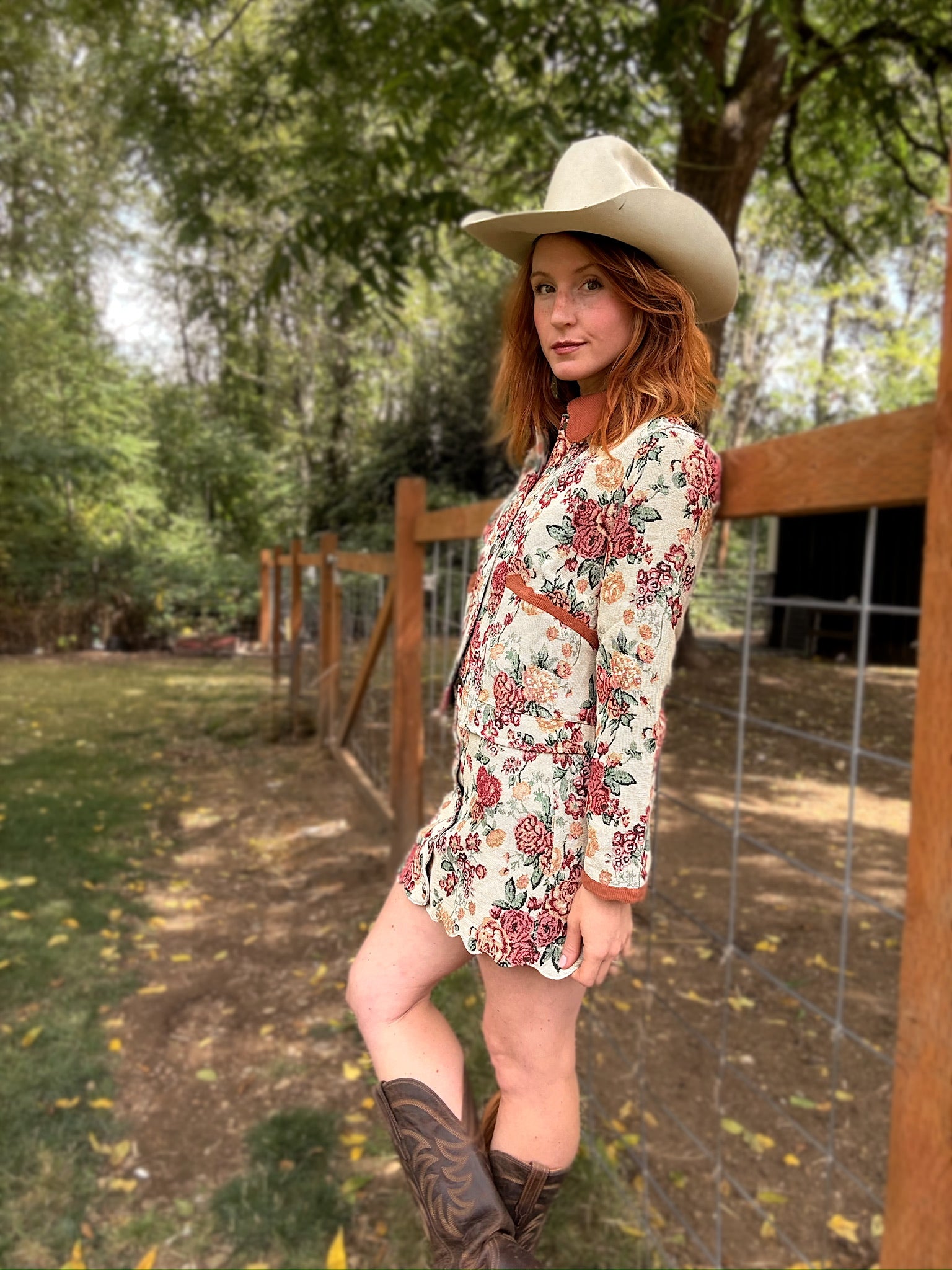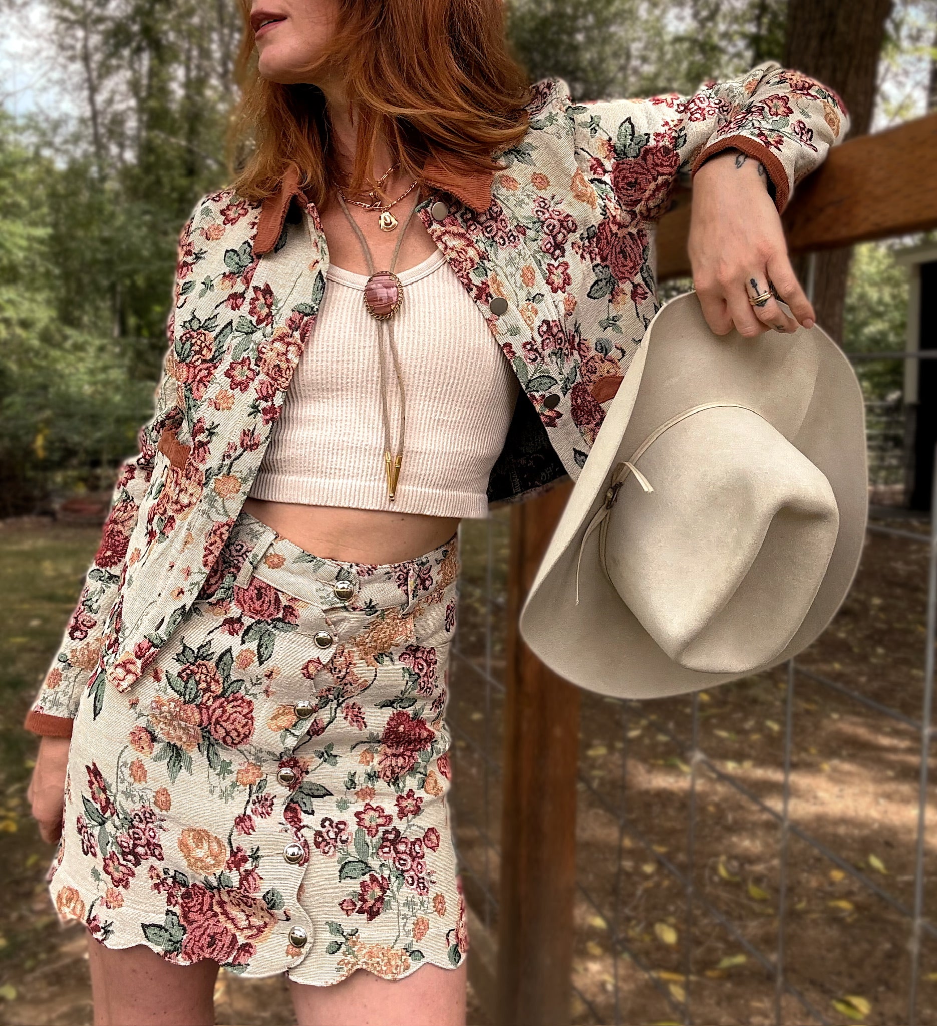 You'll be the talk of the town with the Letting Me Down Jacquard Tapestry Jacket, crafted from bold floral jacquard tapestry fabric. This matching set delivers an unapologetic statement outfit that commands attention with its rich texture and intricate design. Perfect for those who embrace fearless fashion and crave a powerful, unforgettable look. Pair with matching skirt sold separately.