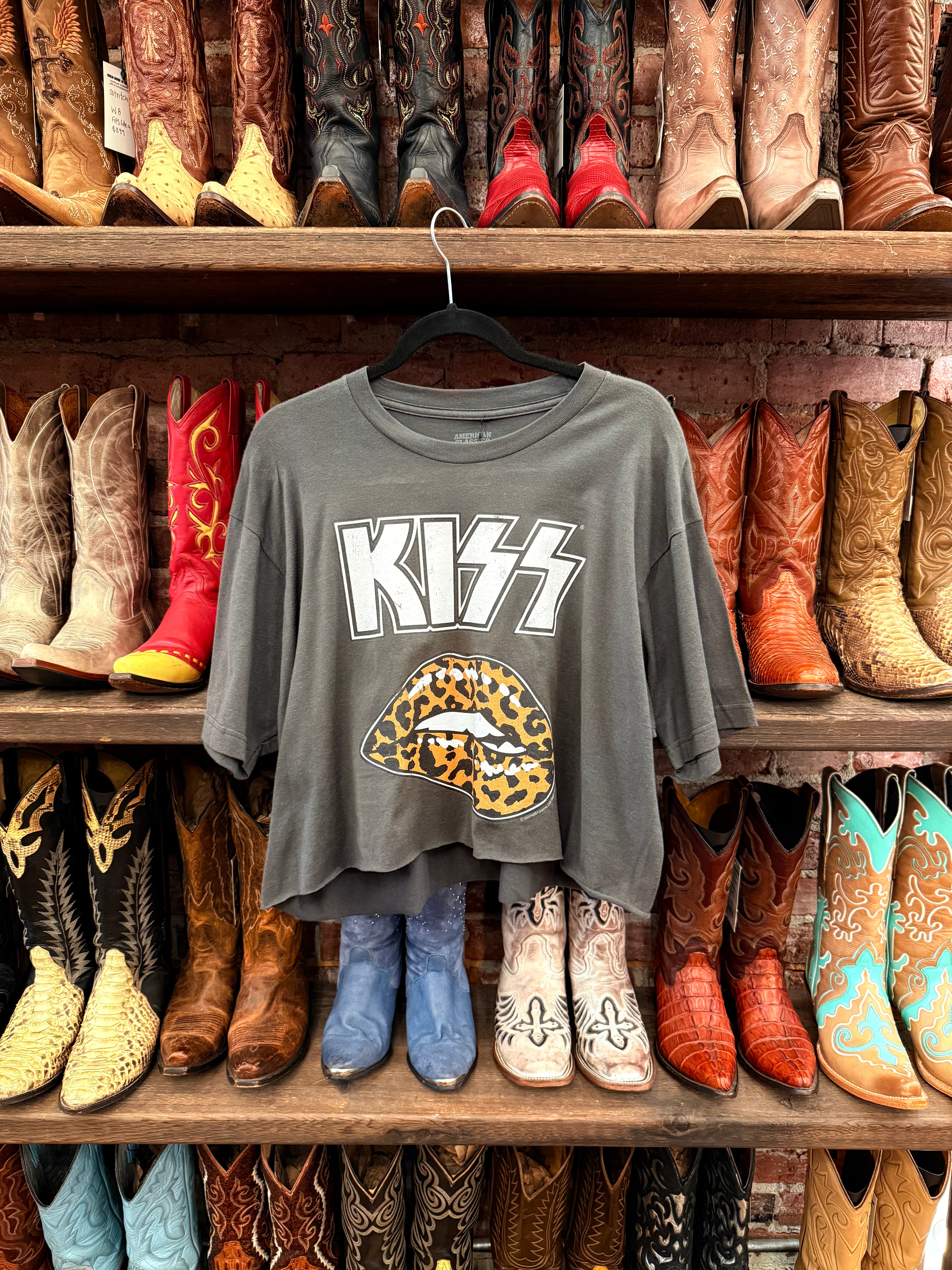 Grab this Leopard KISS crop for any pairing, cut from a mens shirt giving you the oversized crop look.