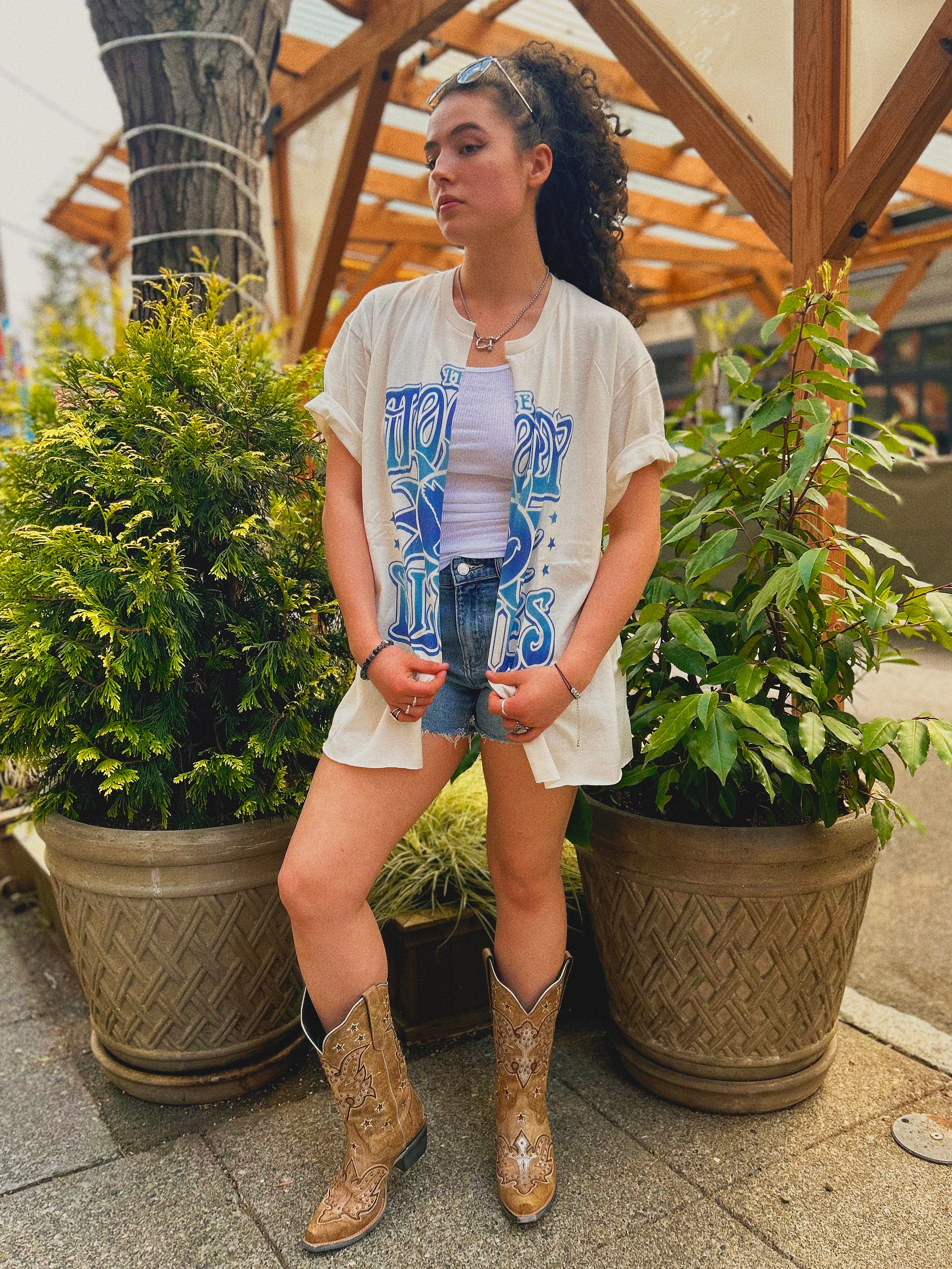We took our super popular Moody Blues mens tee and split it down the middle for an edgier look. Makes the cutest light layer cardigan and pair with your face tank top underneath. Don’t let your outfits be boring anymore!