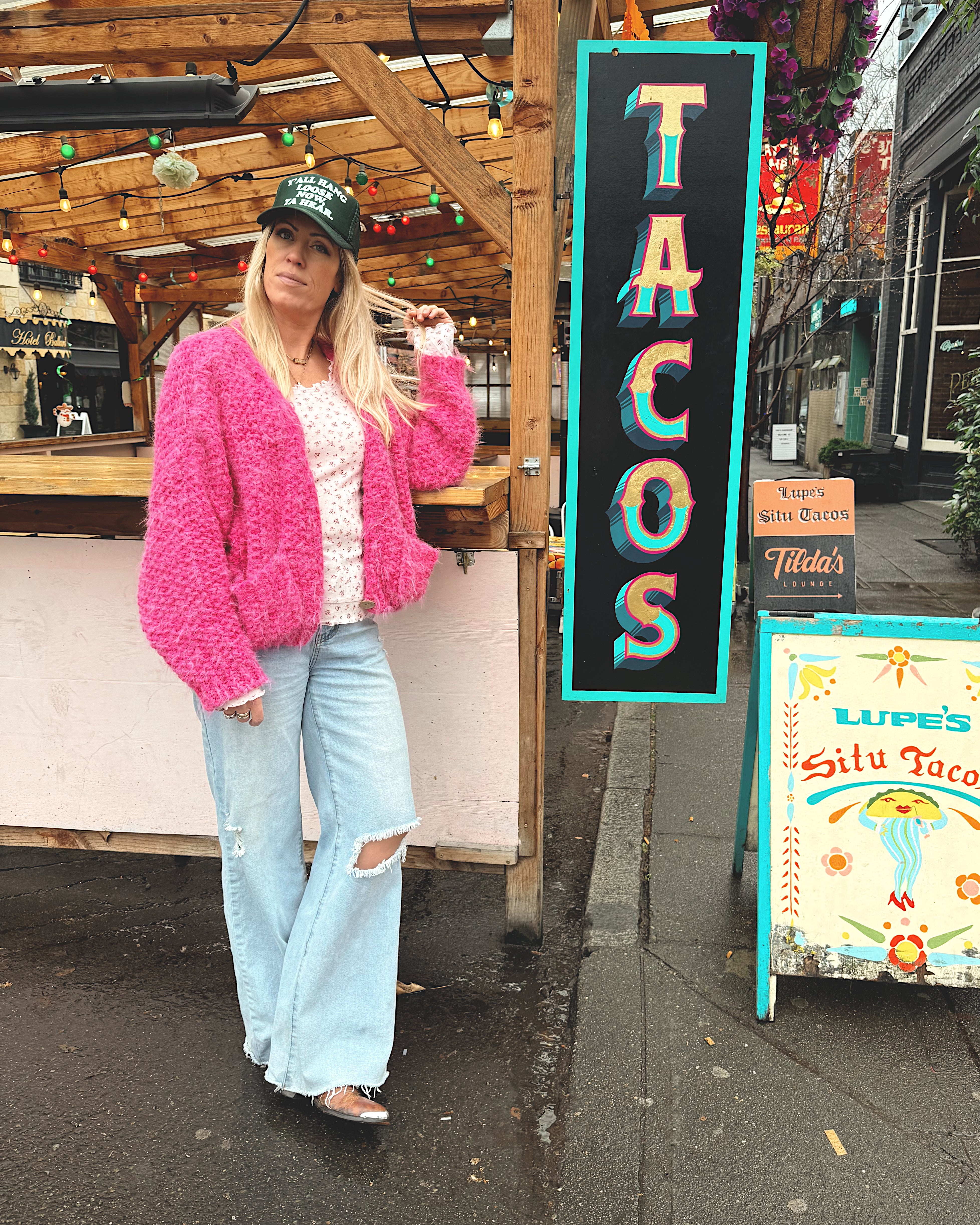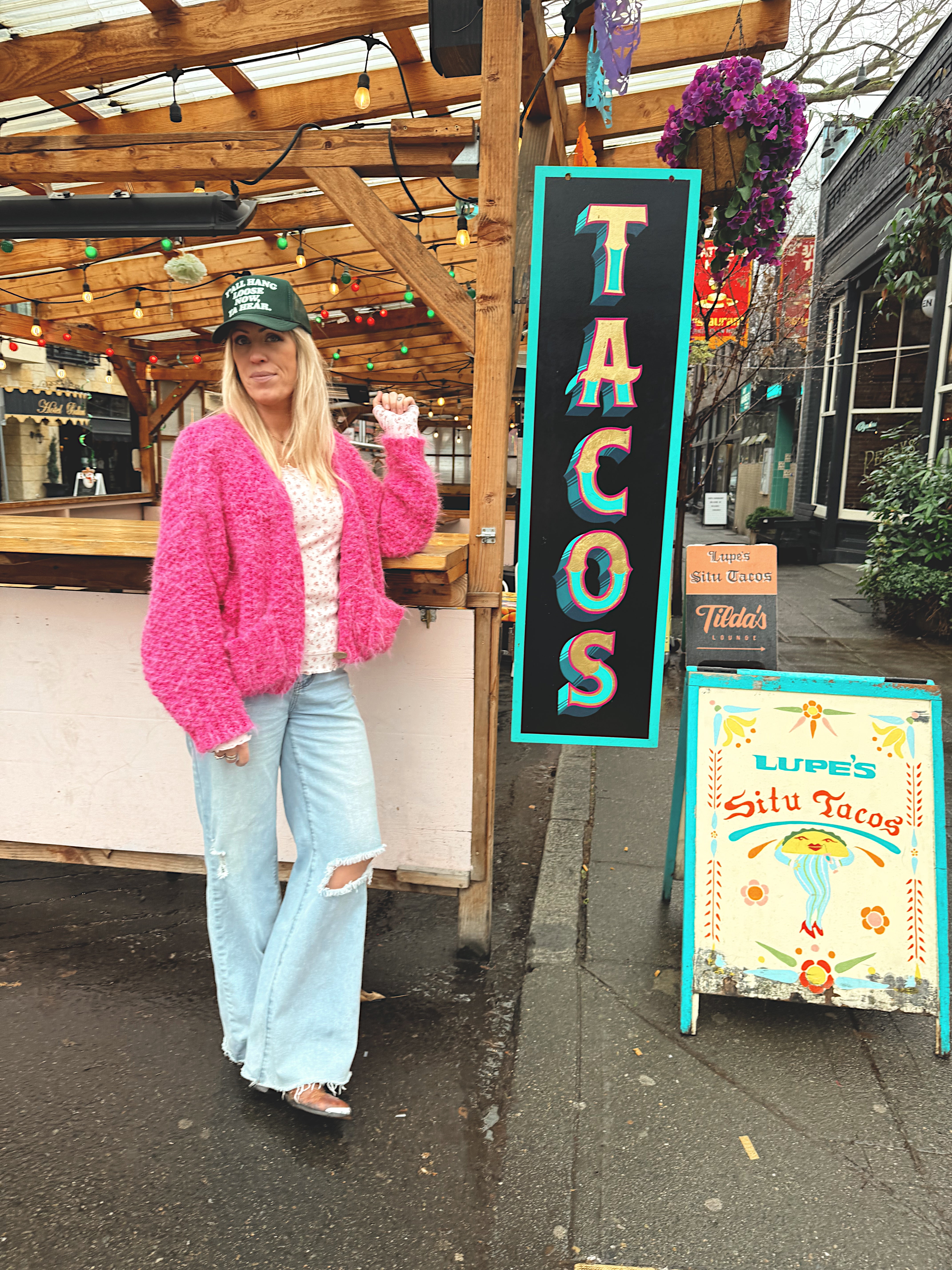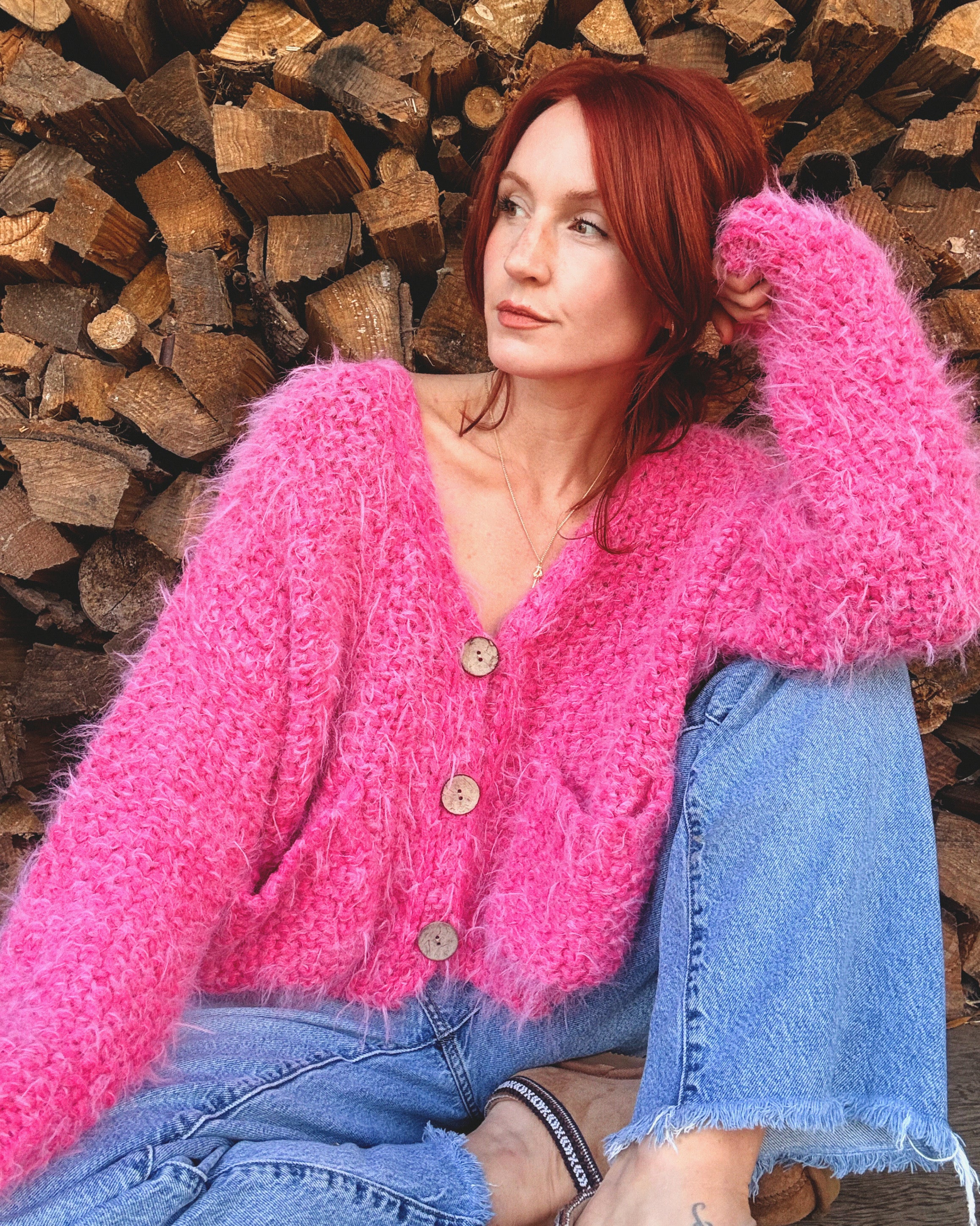 Pretty in pink Big Shot knitted cardigan for women. Perfect as an easy breezy throw-over piece or a staple throughout the season. This versatile oversized cardigan has a three button-up closure and front pockets. We are obsessed!
