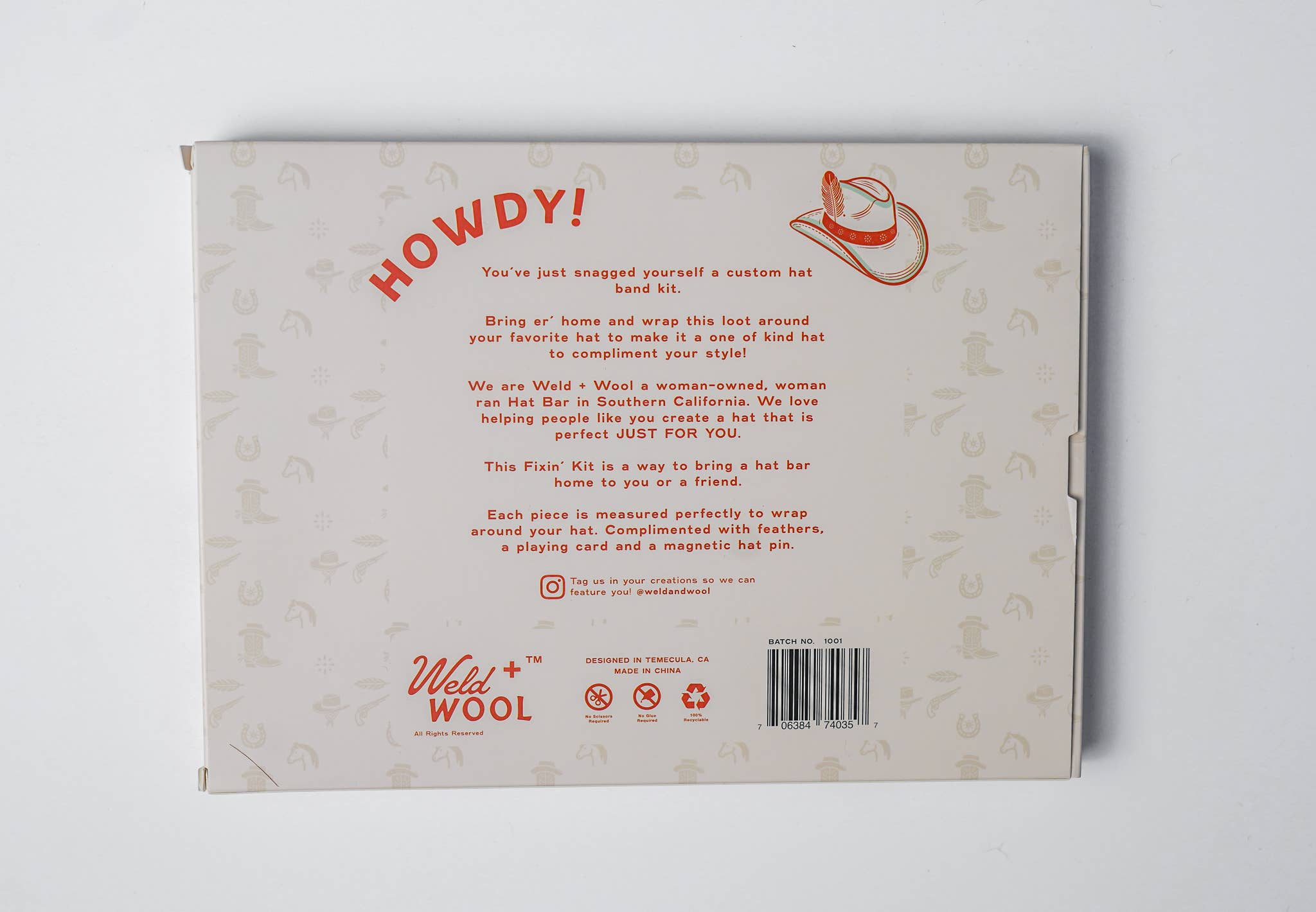Elevate your hat with The Fixin Kit—a curated collection of premium accessories that empower you to add your own creativity to your favorite accessory. Perfect for anyone who loves western fashion, this kit gives you the tools to personalize and enhance your hat with style. Now you can confidently personalize your hat without worrying about damage from glue or scissors, thanks to the magnetic pin that makes decorating hassle-free and secure. Included in the kit: A Specialty Pin – Add a unique, signature touch to your hat, showcasing our magnetic hat pin. A Signature Weld + Wool Playing Card – Our Signature Design with a nod to the brand’s heritage and craftsmanship, this playing card is an exclusive keepsake. Ribbon & Suede – Versatile and stylish, perfect for tying a refined bow or adding a sleek accent to your hat. Feathers – Natural and elegant, these feathers bring a soft, yet bold flair to your hat’s look. No Scissors. No Glue. No Damage to Hat.