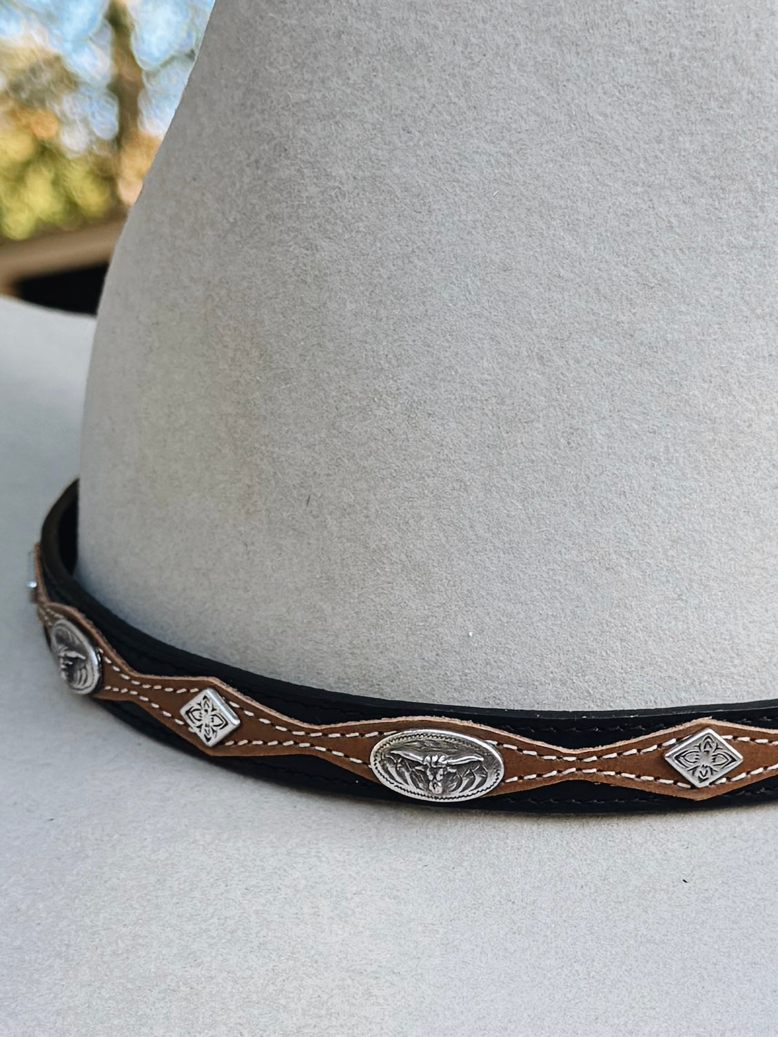 Create your own personalized hat style with this leather hatband by M&F Western Products. Beautiful silver oval shaped conchos with a longhorn motif alternate with a silver diamond shaped concho, which gives a unique look. This style hatband uses a belt style adjustment with a rounded silver buckle.
