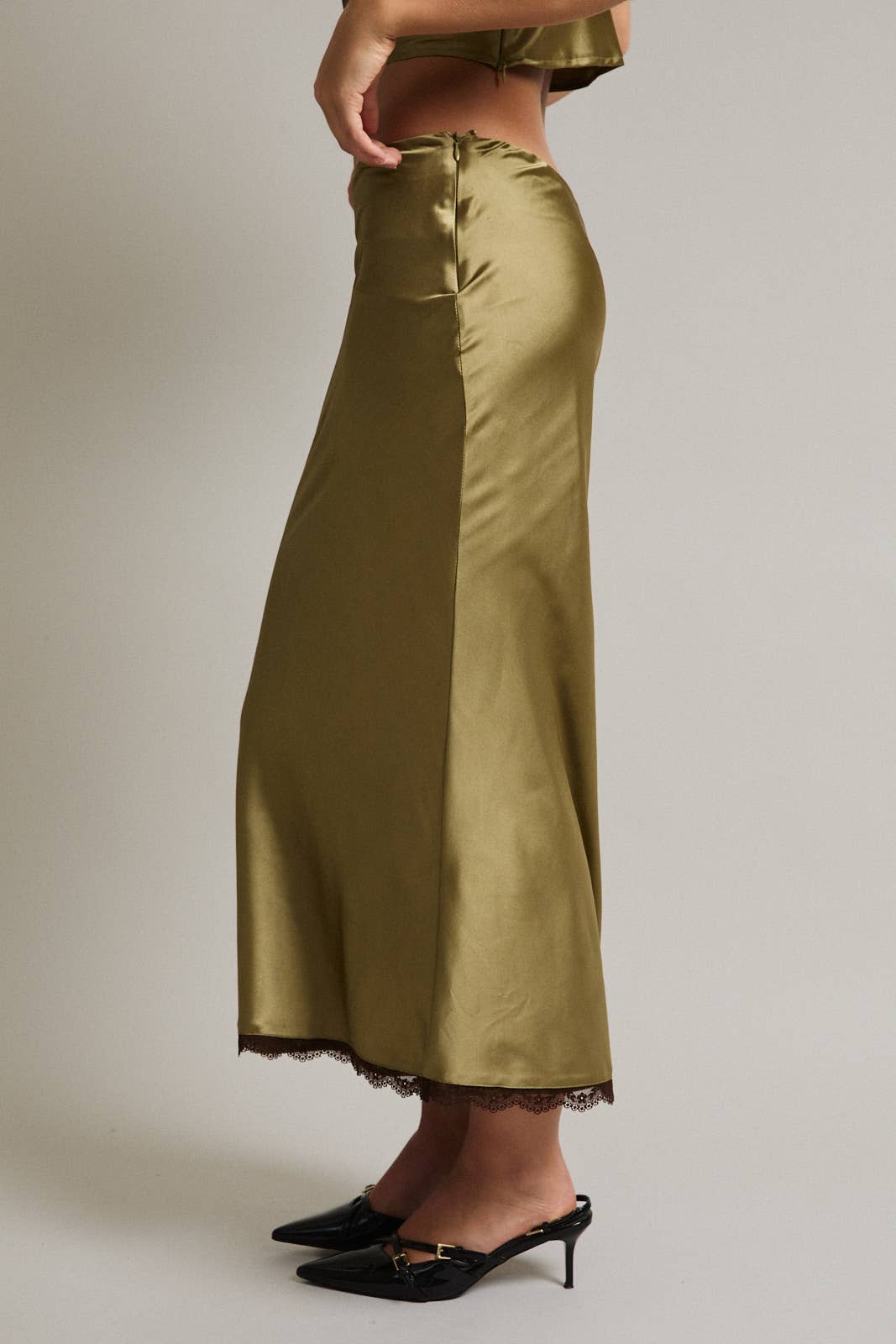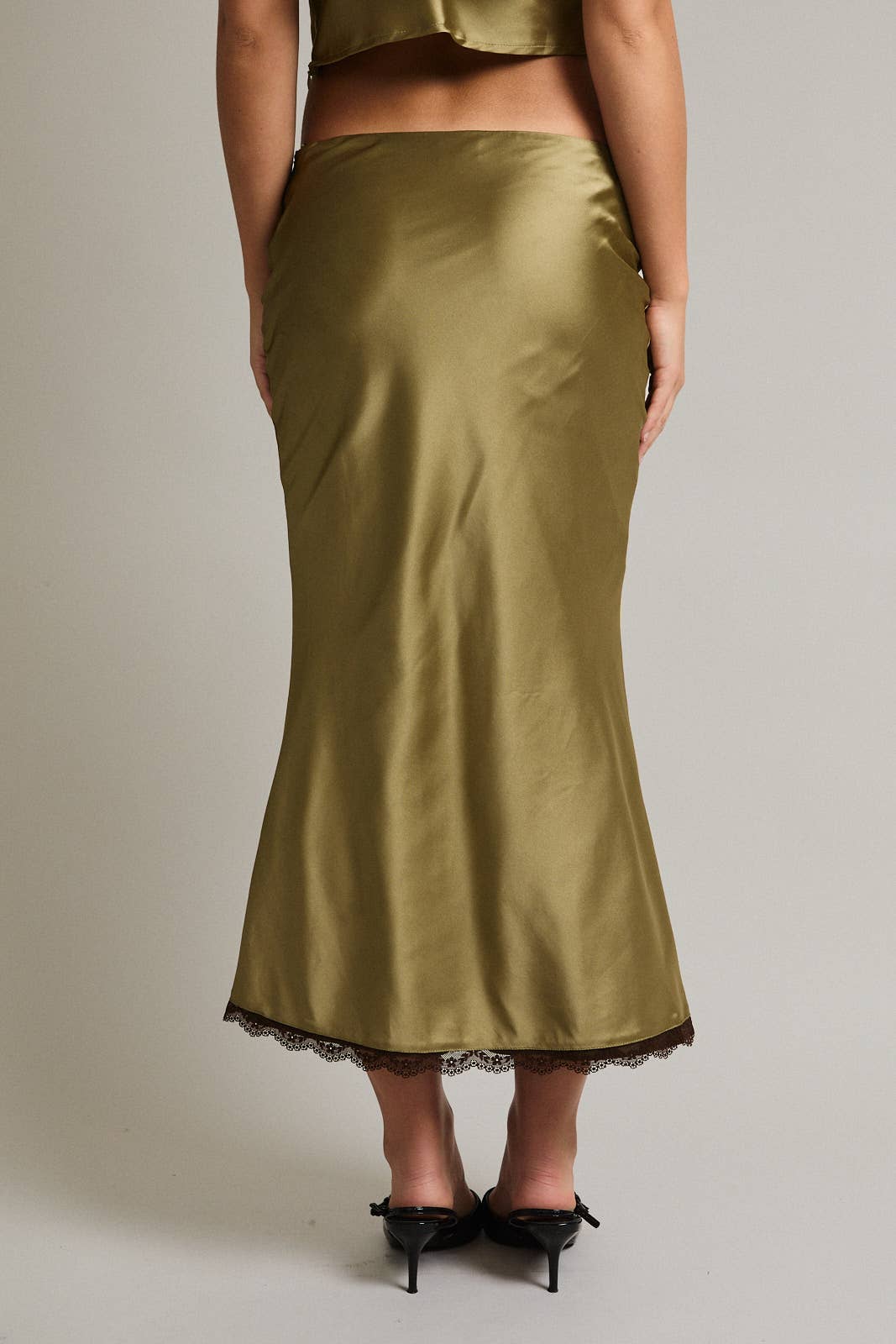 Date night vibe alert! Dream on satin midi skirt is that exactly—a total dream. This romantic satin women's skirt has a hint of black lace trimmed hem and is effortless and glamorous. Pair with boots and your favorite faux fur.