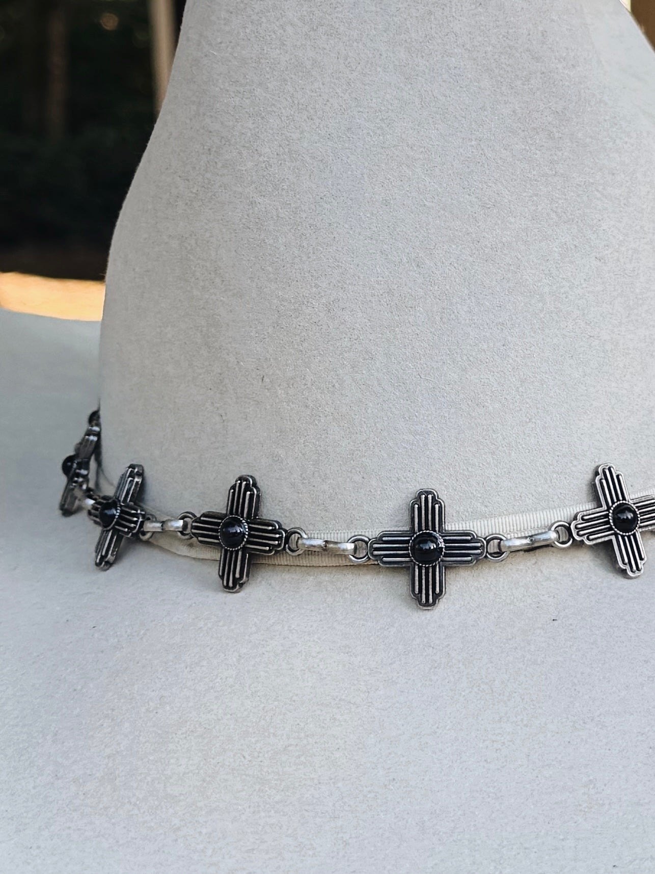 3D hatband by M&F Western Products. Engraved cross concho in gun metal with a black stone center. Lobster claw clasp.