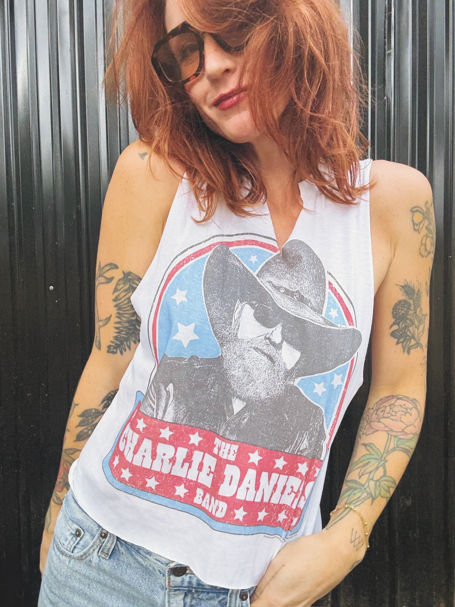 Custom Chop Shop Charlie Daniels Band Tank features, a small v-neck, cropped bottom, and thick tank sleeves. Each Custom Chop Shop T-shirt will be unique as each is hand created.