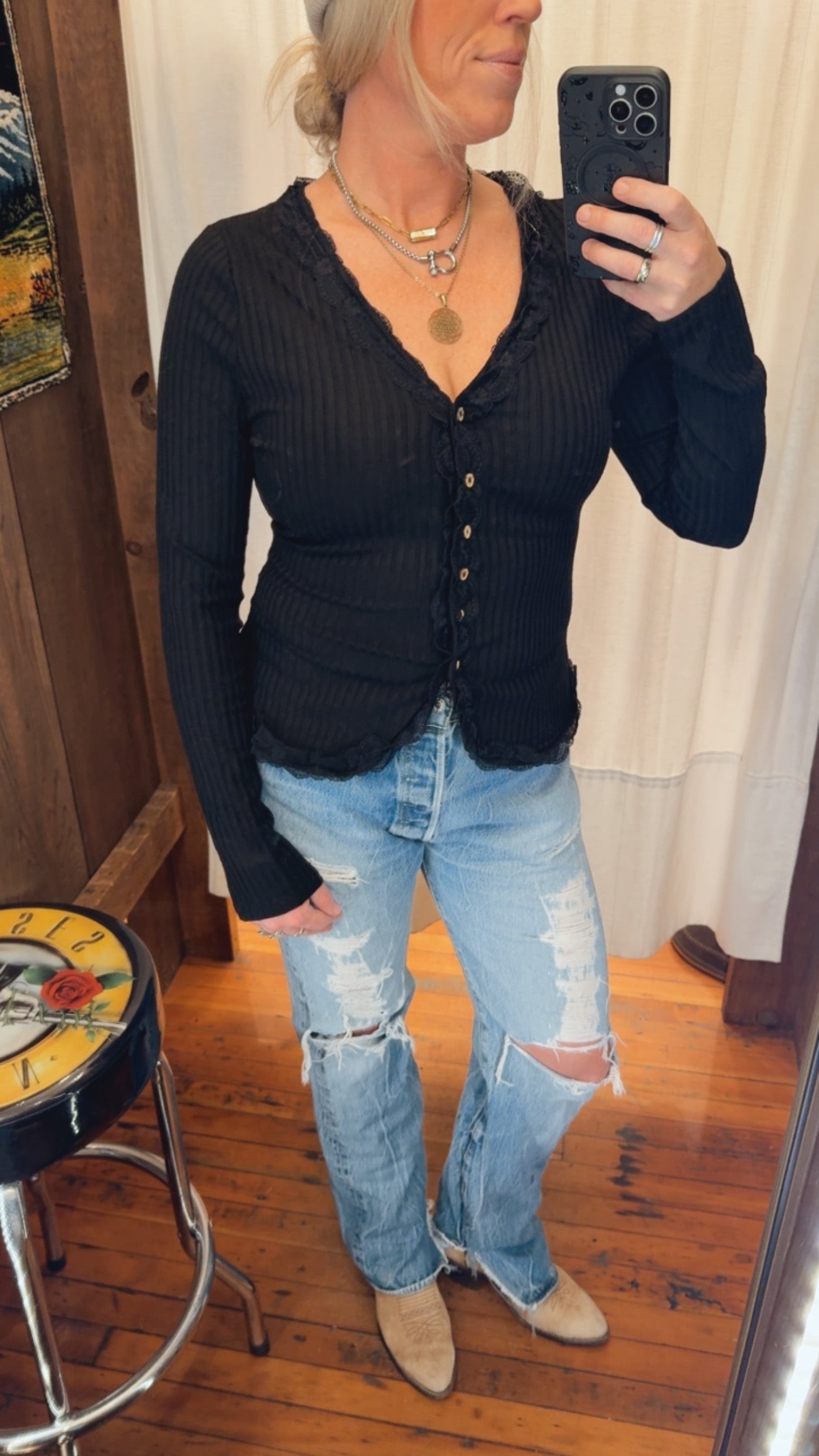 She's The One for everyday. All occasions, with a lace trim v-neck and button up front. This is an easy layering piece or a show stopper all of it's own.