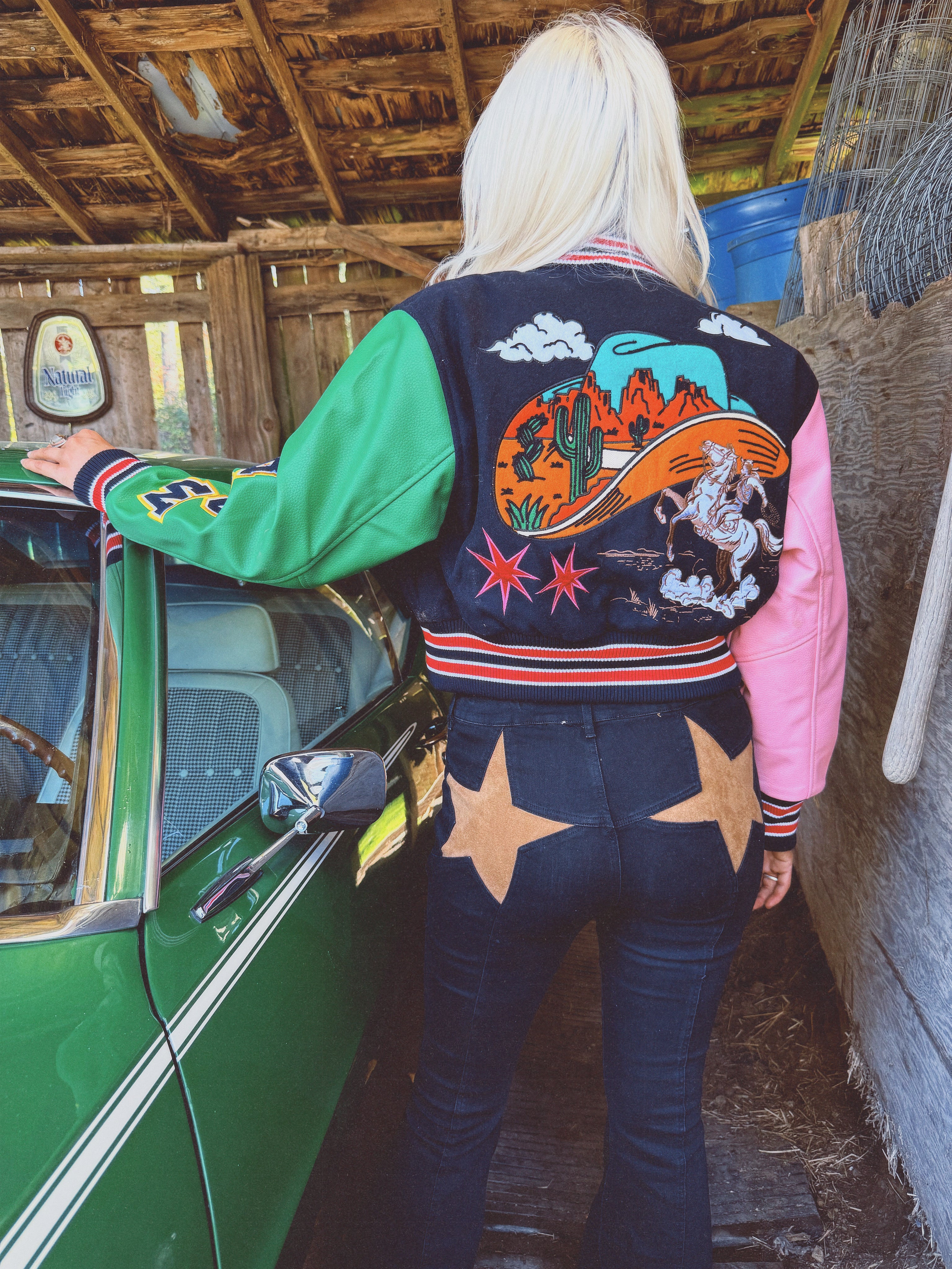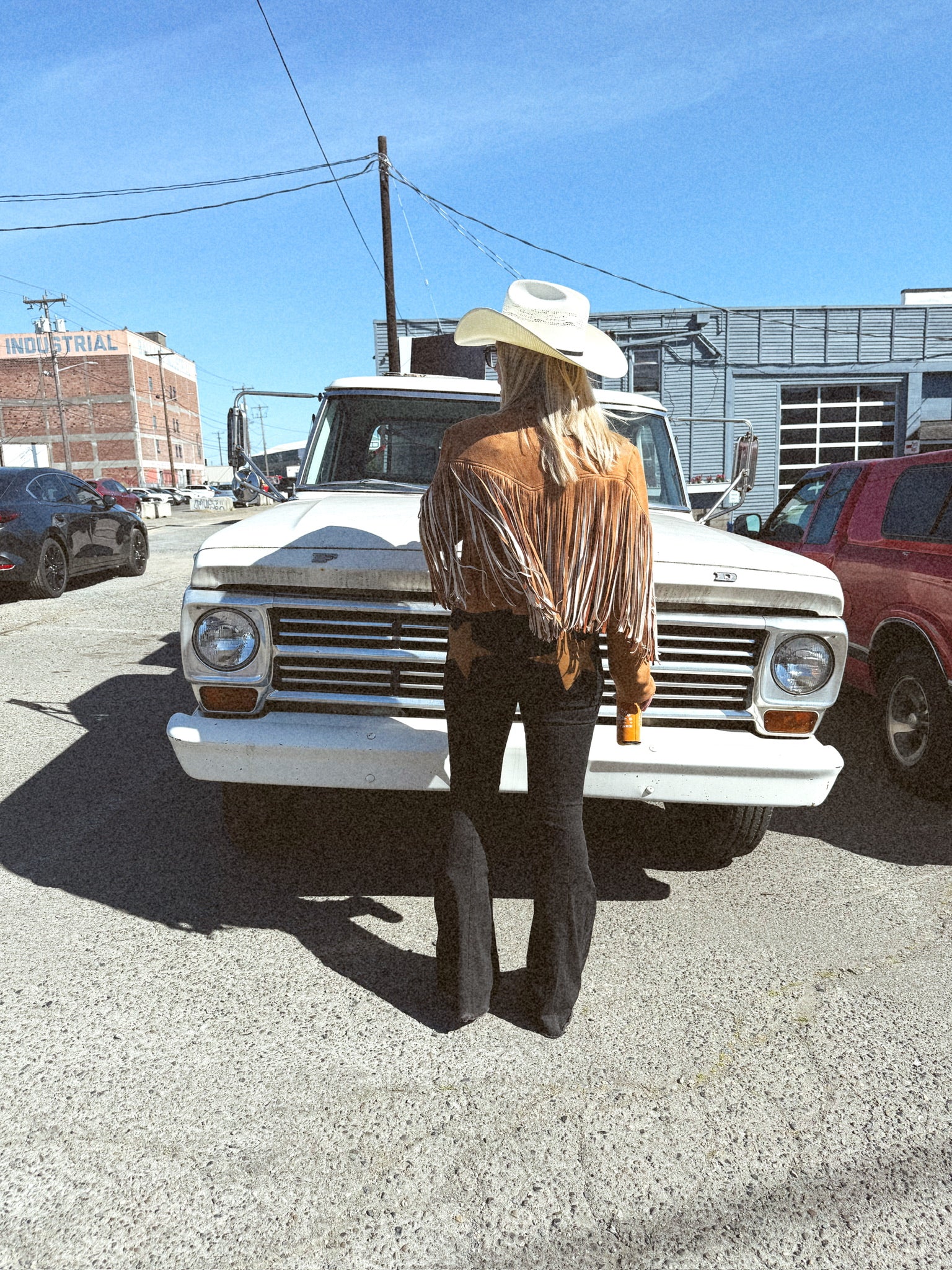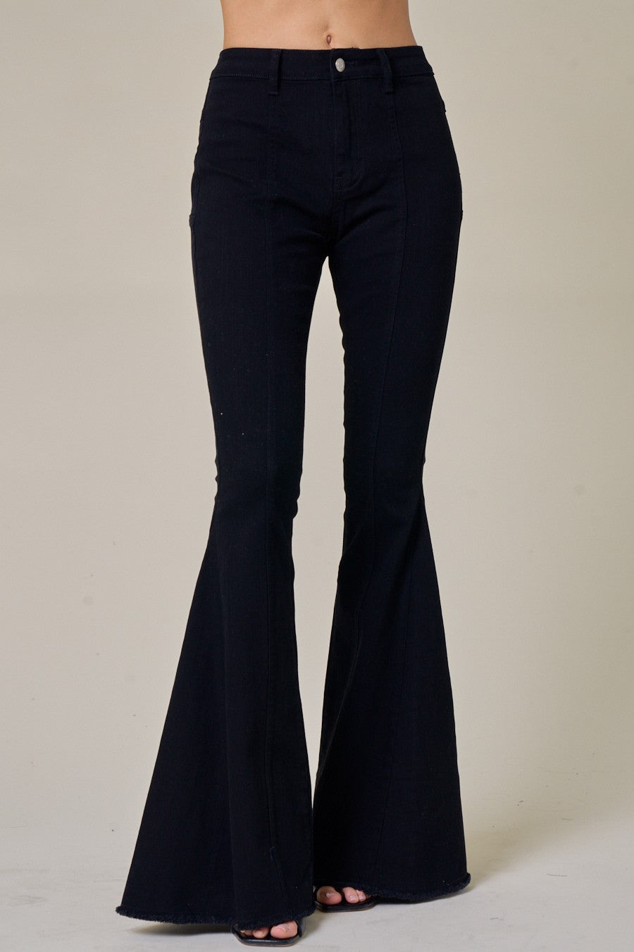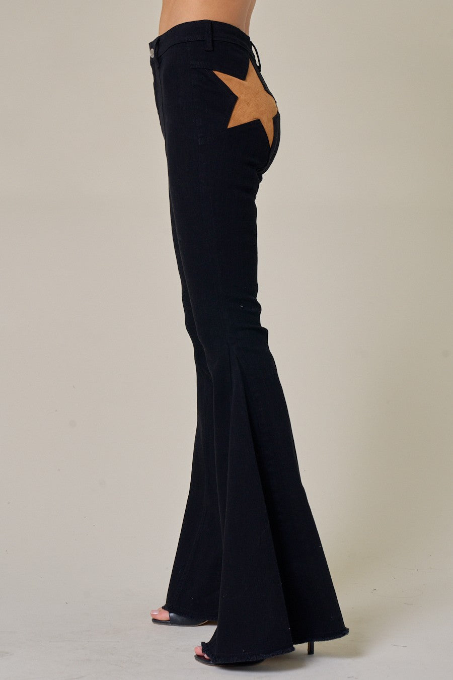 Your new favorite statement pant has arrived. These ultra-stretchy, high-waisted bell bottoms are made for summer moments—with suede brown star details on the back and a raw destructed hem you can trim to the perfect length. (Yep, they’re long on purpose.)