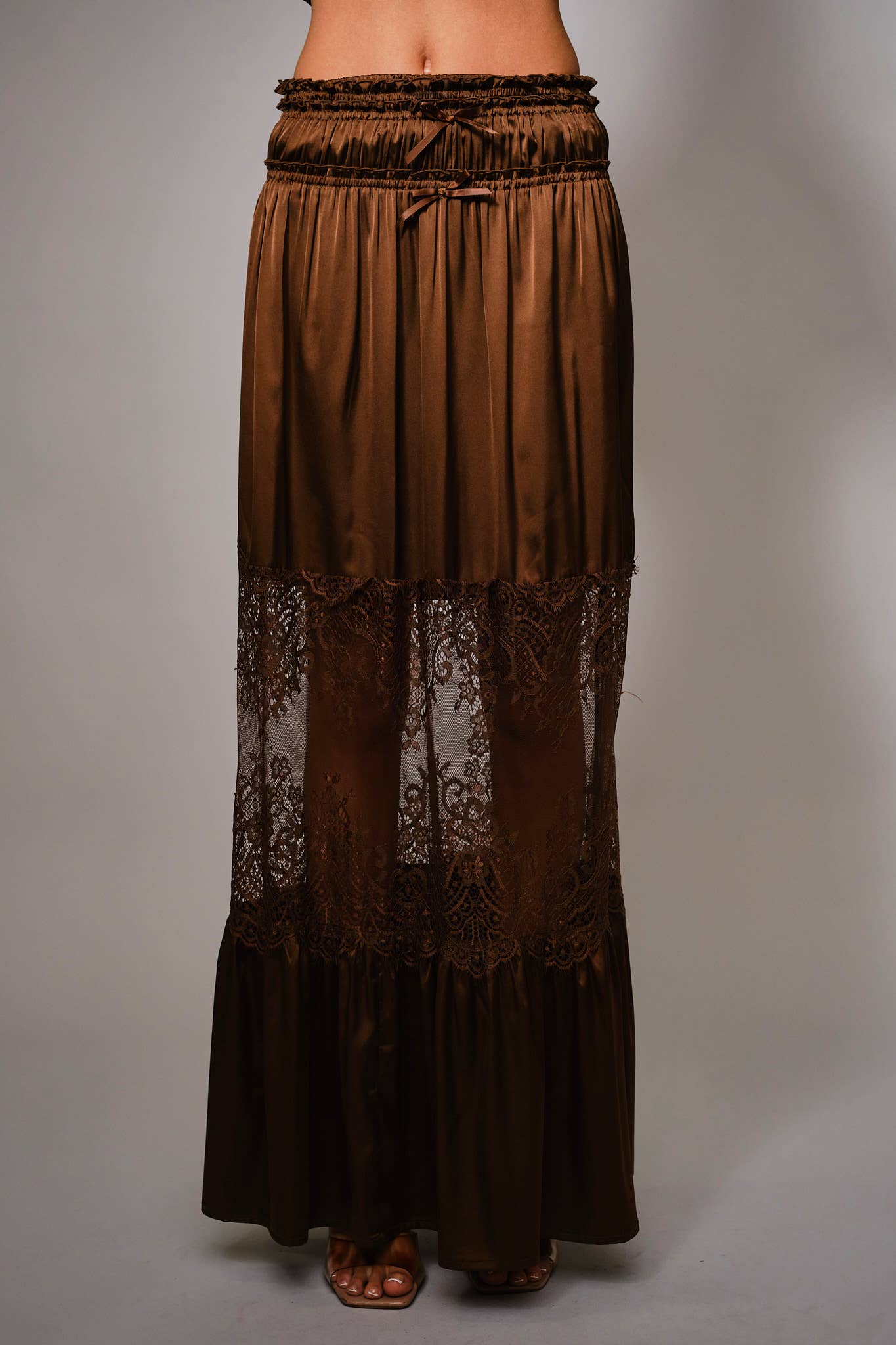 Our Midnight lace maxi skirt blends sweet lace with a satin edge. Designed with a soft elastic waist and cut off slip, this is a head turner. Layer with your favorite band tee and leather jacket, or dress it up for a night out.