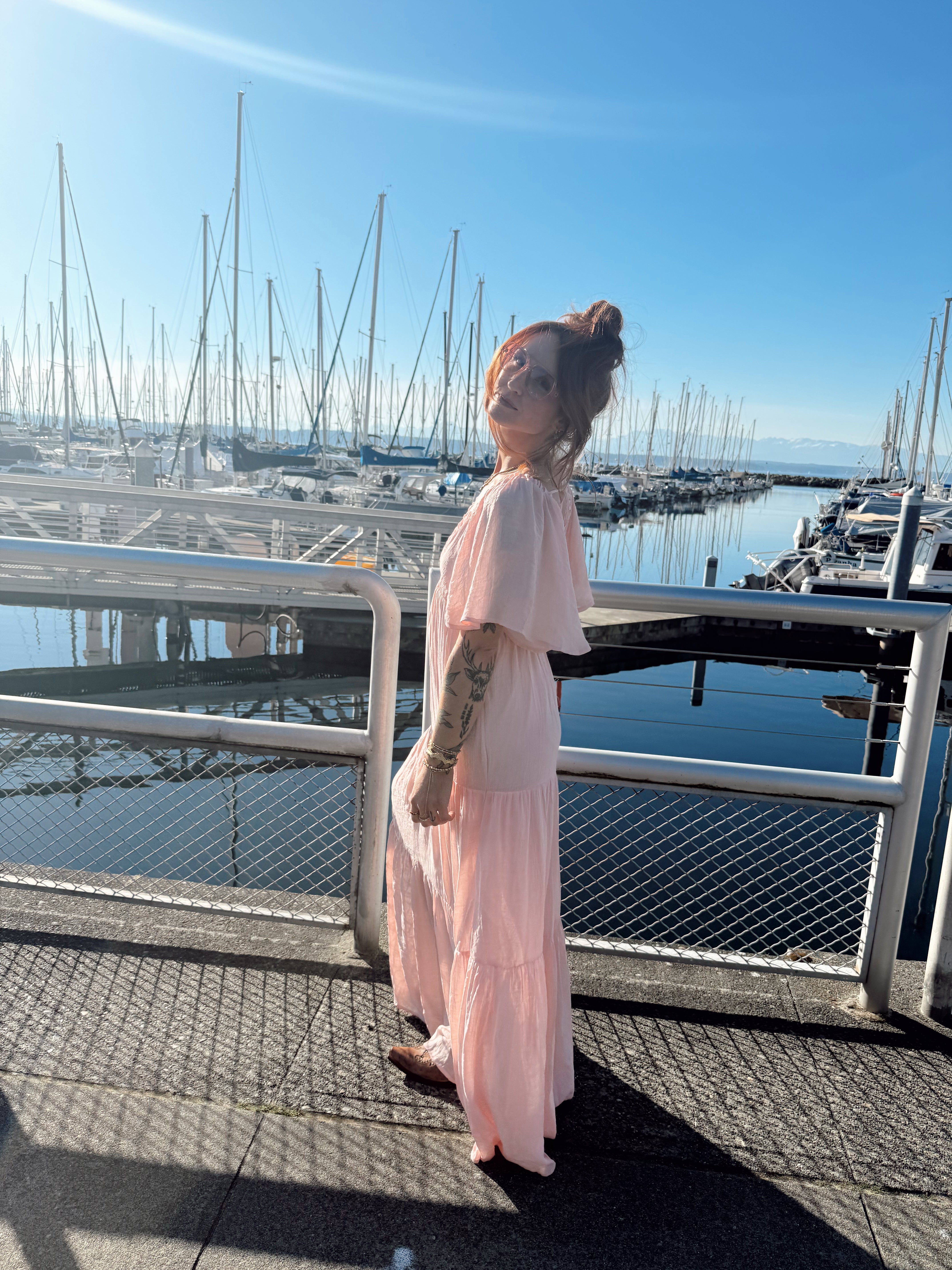 Our Cruel Summer butterfly sleeve maxi dress was designed for free spirited sunny days. With a deep front v-neck, open back, and elastic waistband, this bohemian free spirited look will turn heads.