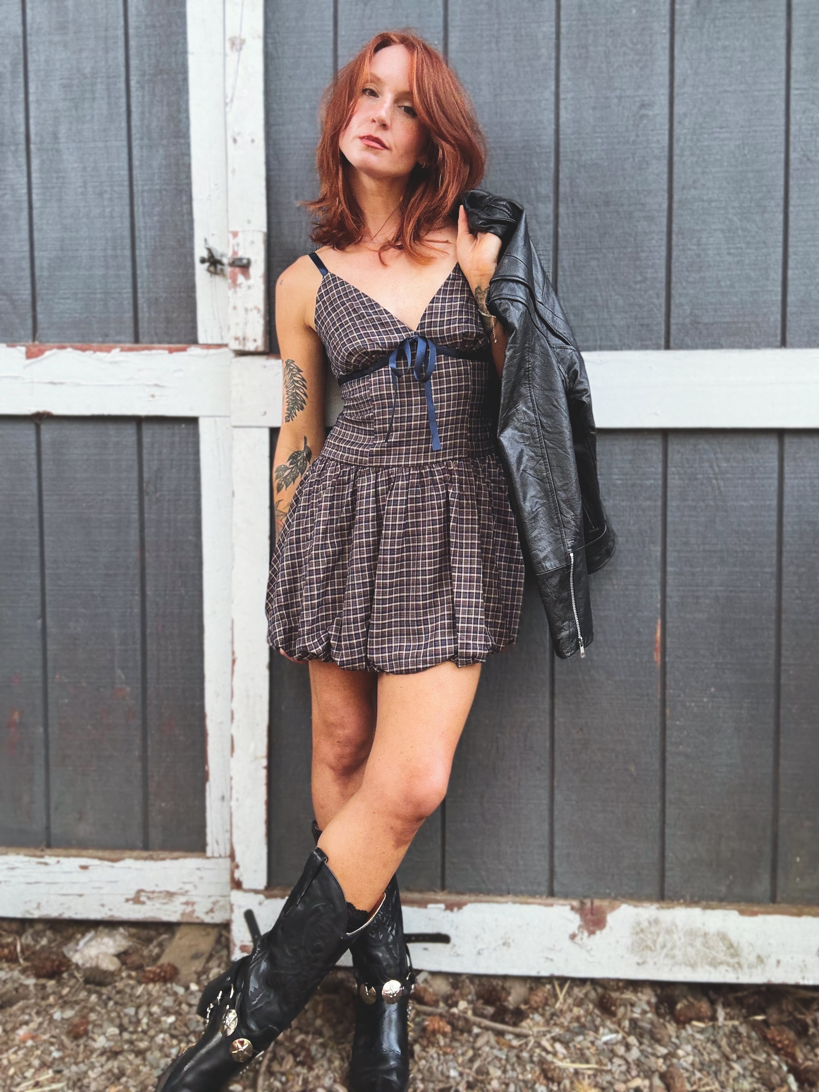 The Good Time Plaid Dress is where cozy meets carefree. Made in a soft navy-and-tan plaid, it features a flattering V-neckline, delicate ribbon tie detail, and an easy-fit silhouette that flows into a playful, gathered skirt. Whether you’re headed to a country concert, a fall bonfire, or just kicking back with friends, this dress brings a laid-back charm with a touch of flirt. Pair it with boots and a denim jacket for the ultimate Western-inspired look.