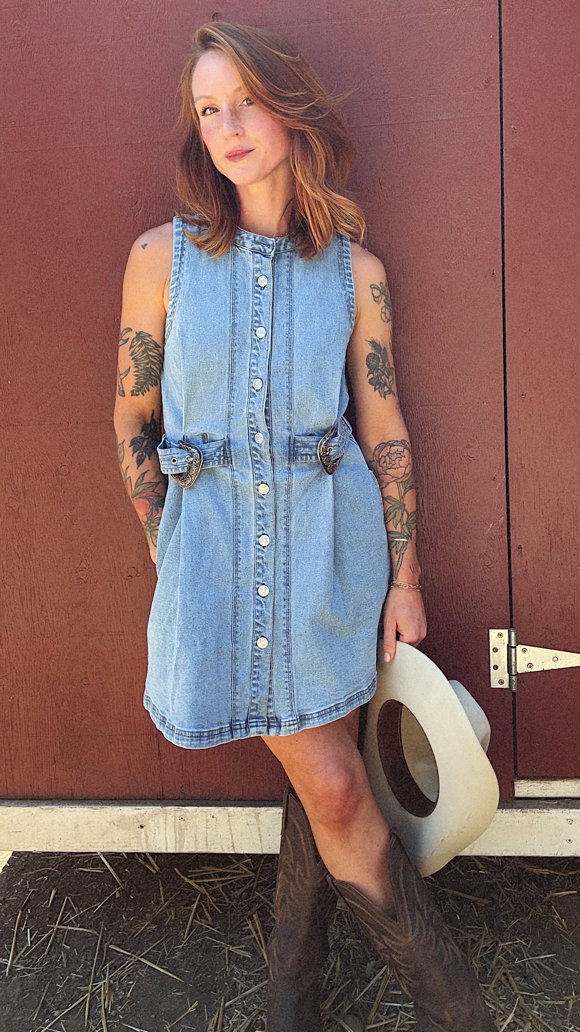 Mini denim dress with a button-up front, sleeveless design, and western buckle belt detail. Features a slight stretch for comfort and a flattering fit.