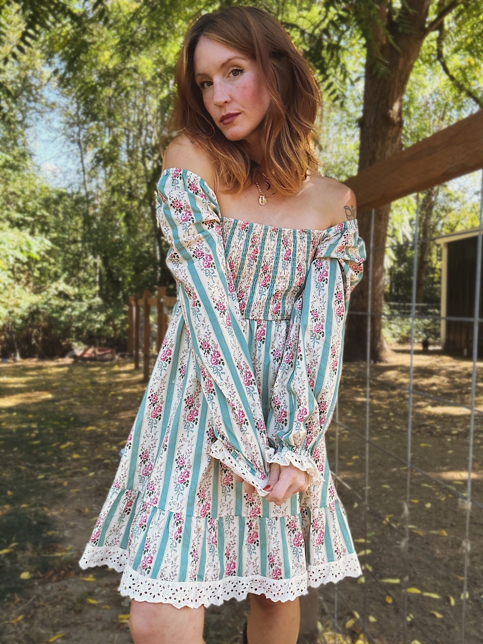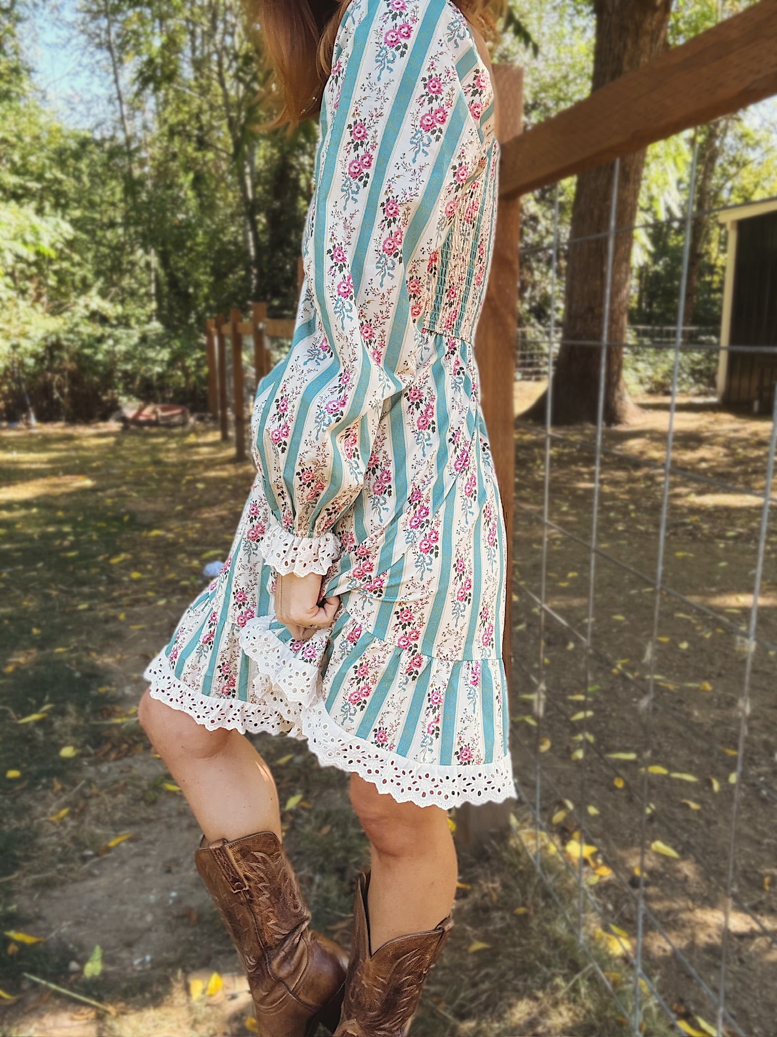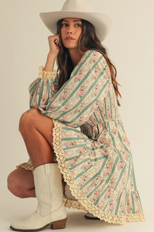The Just In Case Mini Dress is the perfect choice for a country concert look, featuring floral smocked lace detail for a flattering fitted bodice that keeps you comfortable all day and night. Its soft pastel hues add a touch of sweet, laid-back charm, making it easy to pair with boots and a denim jacket for effortless country style. With a lace trip at the cuff of the sleeve and skirt hem, this is the sweetest addition to your fall wardrobe.