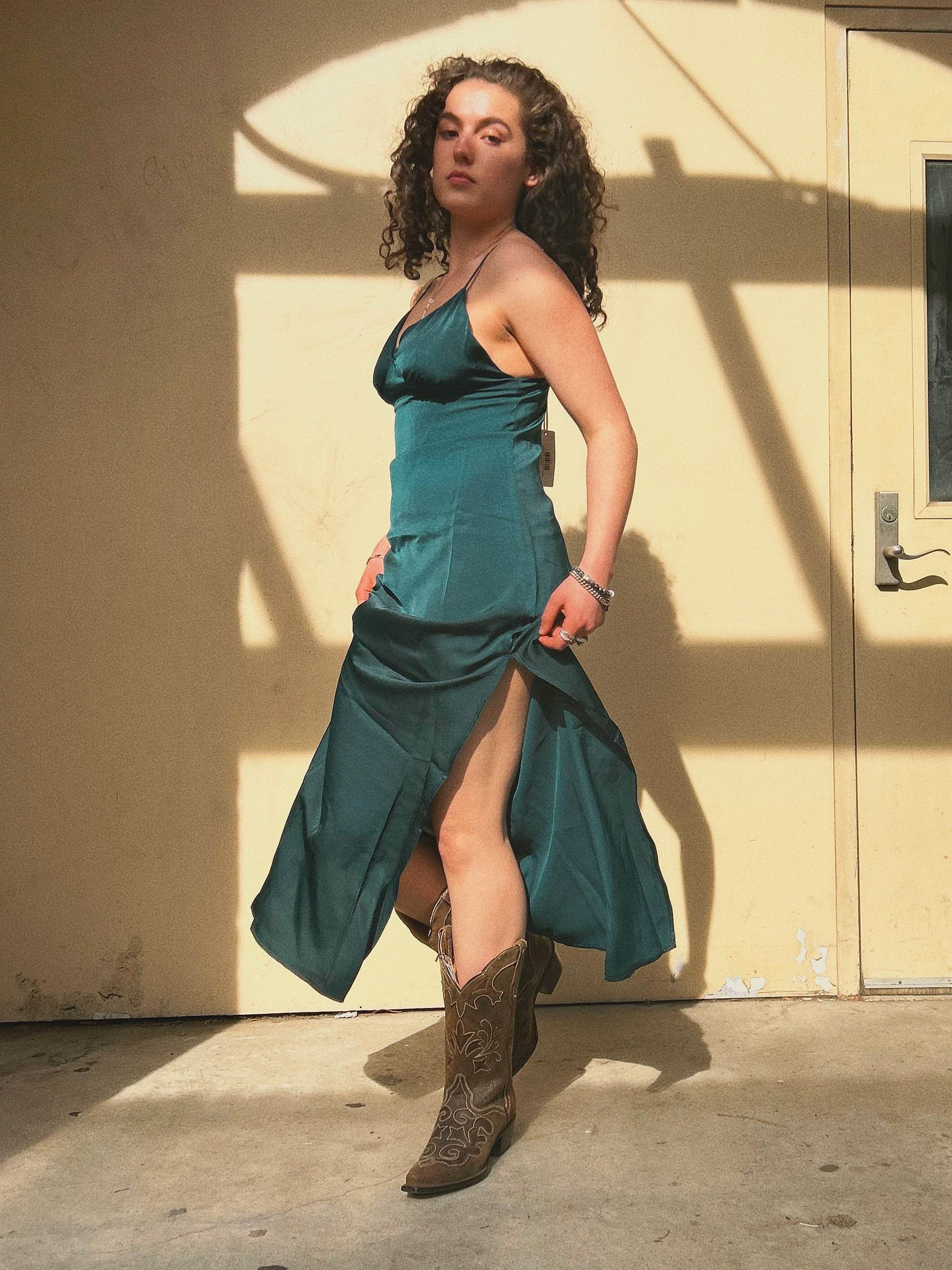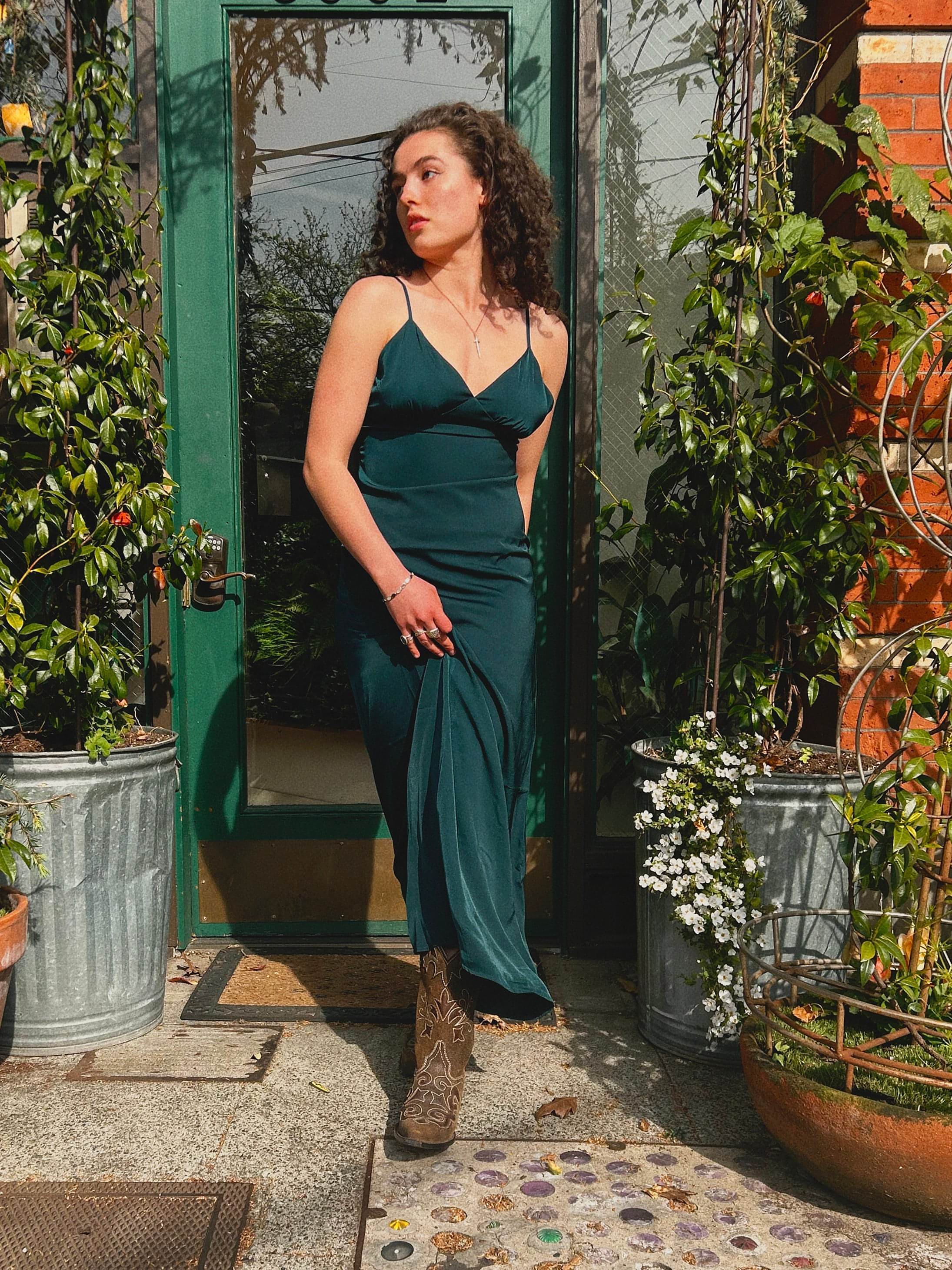 This deep green Satin Maxi is the basic we all need. On its own, or with a chop shop band tee thrown on top this is for all. The side slit gives the freedom of movement and a peak at your choice of boots!