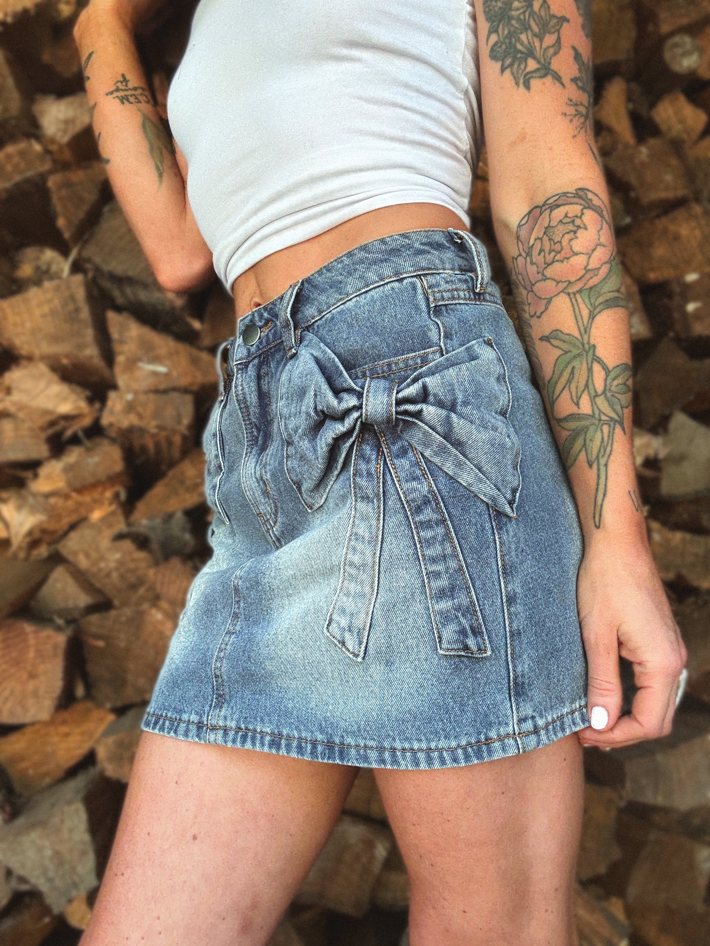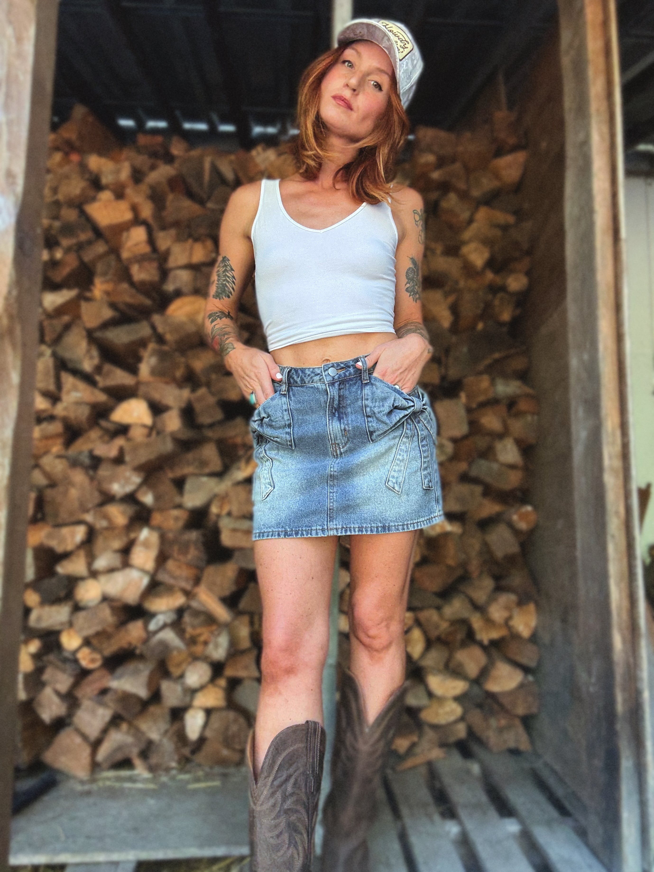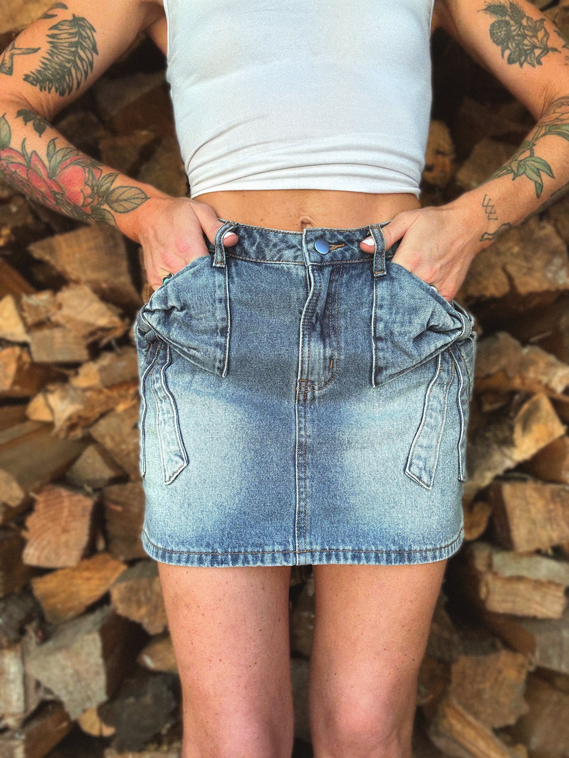 Our Make It Sweet Denim Skirt is the summer addition you need. A perfect elevated basic with the bow pocket details; this is a show stopping versatile piece.